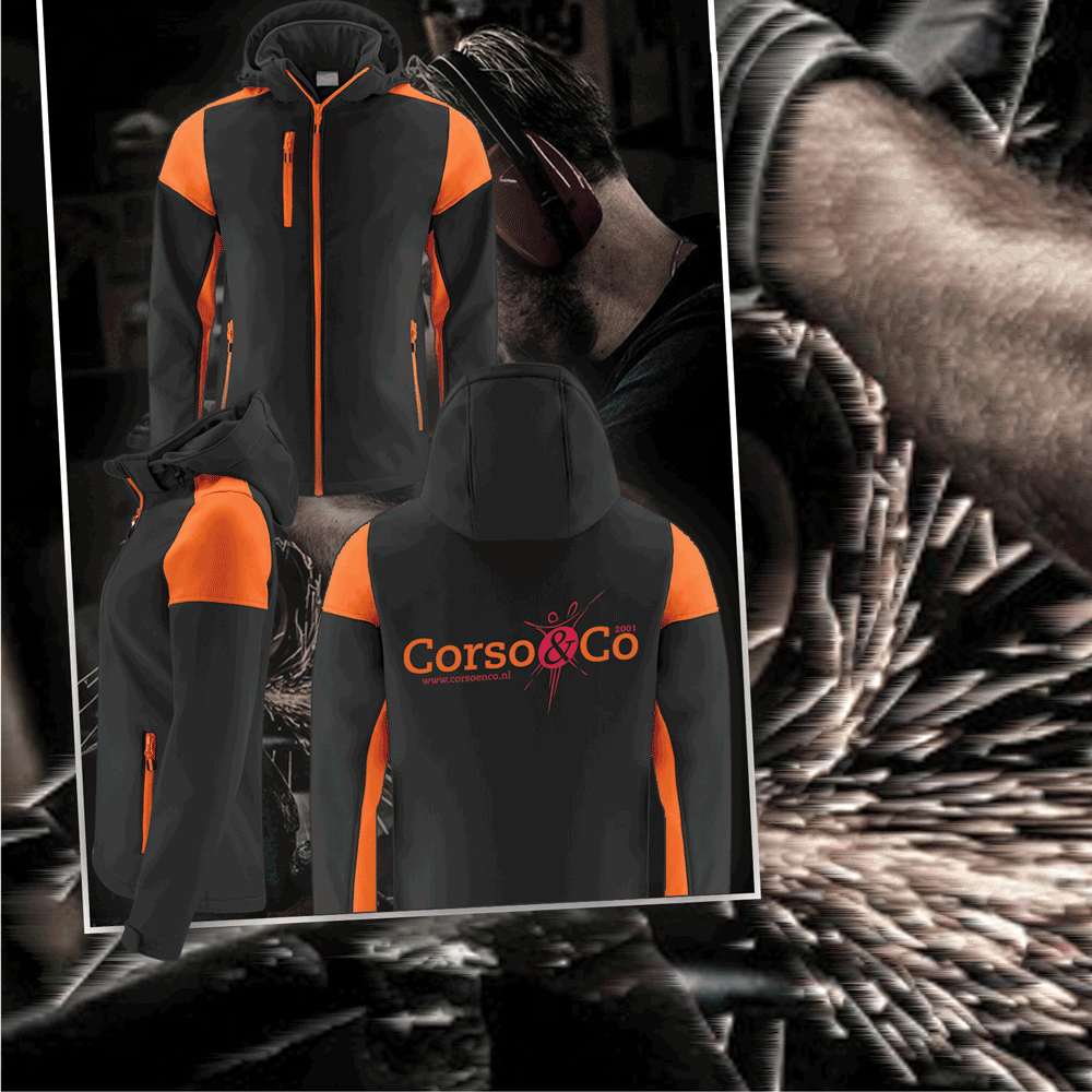 Bicolor softshell jas met afneembare capuchon. Contrasterende ritssluiting vooraan en aan de zijzakken. Aanpasbare mouwen met velcrosluiting. Uiteraard uitgevoerd met één van onze Corso&Co logo’s op de achterzijde.